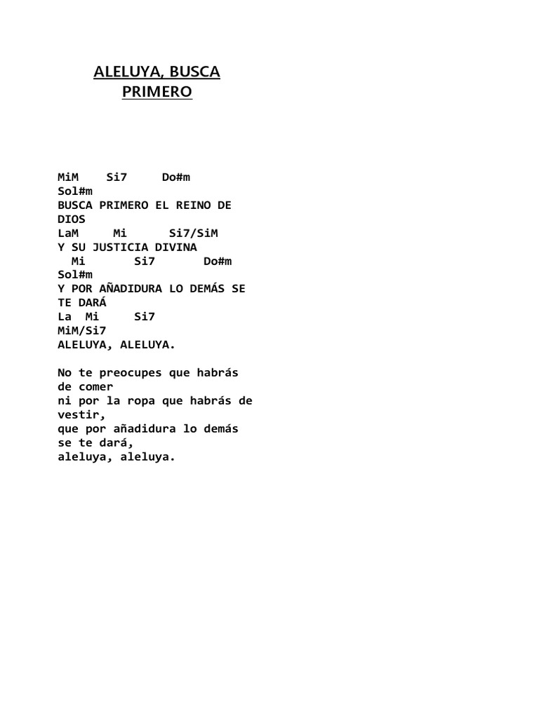 Aleluya Busca Primero Acordes / Buscad primero el reino de dios, y su justicia perfecta, y lo demas anadido sera; Aleluya Busca Primero Acordes : Aleluya (busca primero el reino de dios) aleluya, alelu, aleluya, aleluya, aleluya.